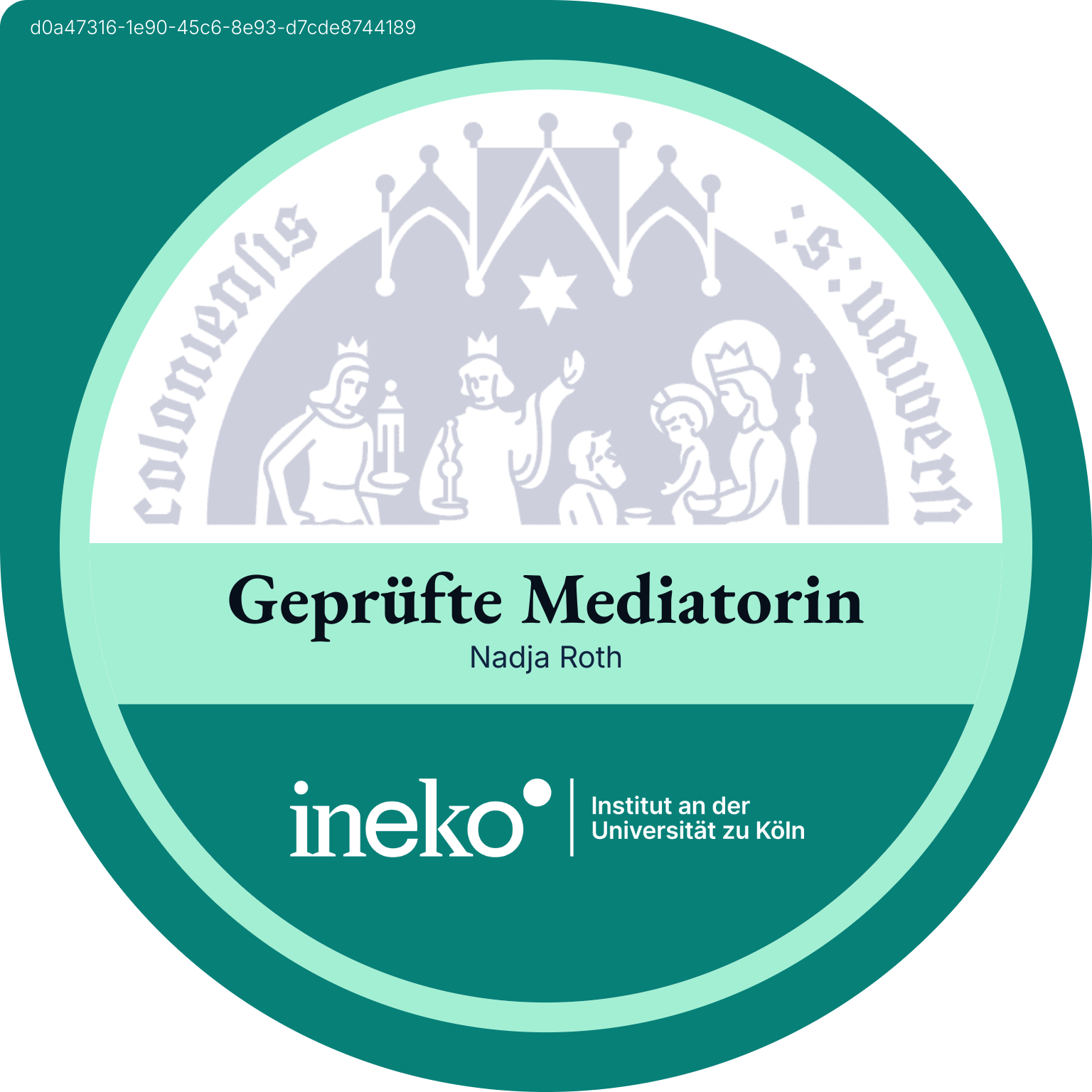• Geprüfte Mediatorin (INeKO Institut an der Universität zu Köln) und Mitglied des BMeV